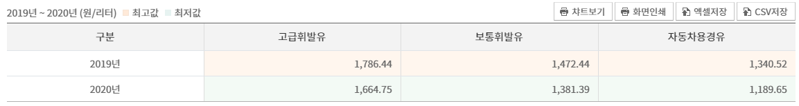 2019년, 2020년 유가를 나타낸 표이다.