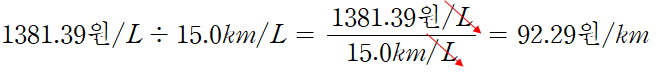 1,381.39원/L ÷ 15.0km/L = 92.09원/km > 이 값이 1km 당 유류비이다.