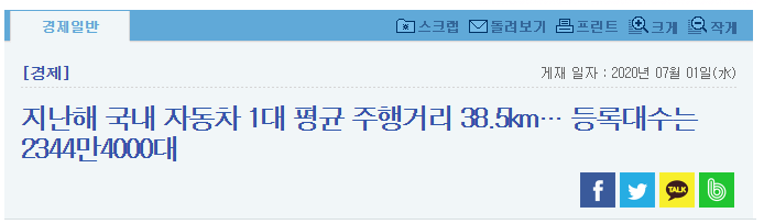 교통안전공단에 따르면 2019년 국내 자동차 1대 하루 평균 주행거리는 38.5km라고 한다.