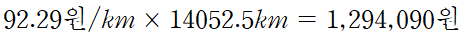 이제 마지막이다. 1km 당 유류비를 구했으므로 여기에 주행거리를 곱해주면 된다.