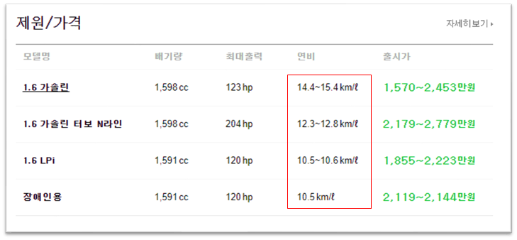 위 그림을 보면 아반떼 1.6 가솔린의 연비는 14.4~15.4km/L이다. 평균값인 15.0km/L로 계산해보자.