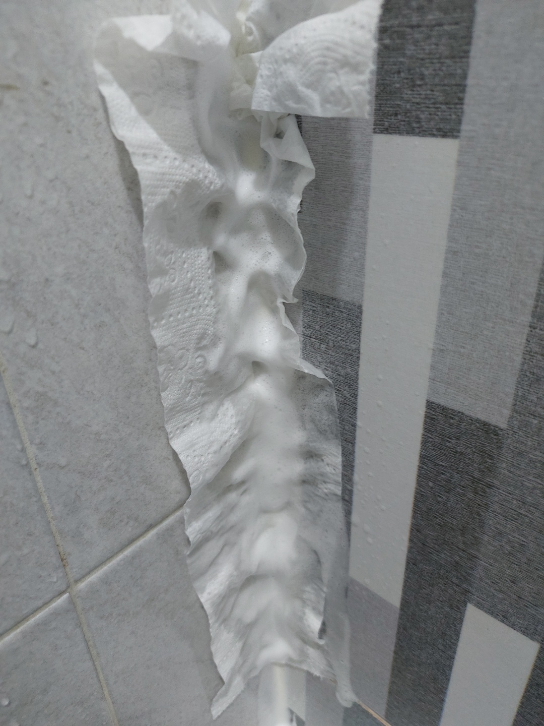휴지를 덧대면 곰팡이 제거제를 더 오래 머물게 하는 효과가 있습니다.