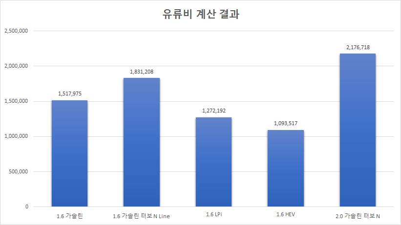 다만 여기서 계산한 유류비는 평균연비입니다. 운전자의 습관 그리고 유가에 따라 유류비는 바뀔 수 있습니다.
